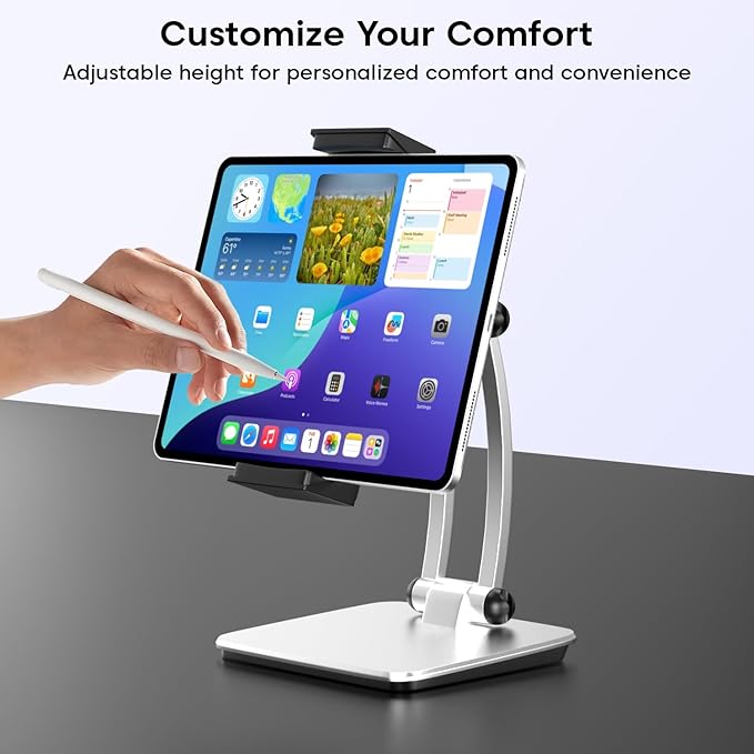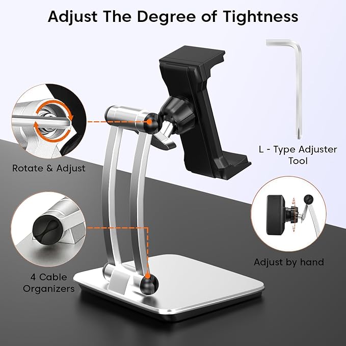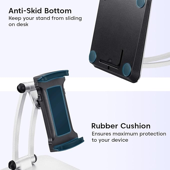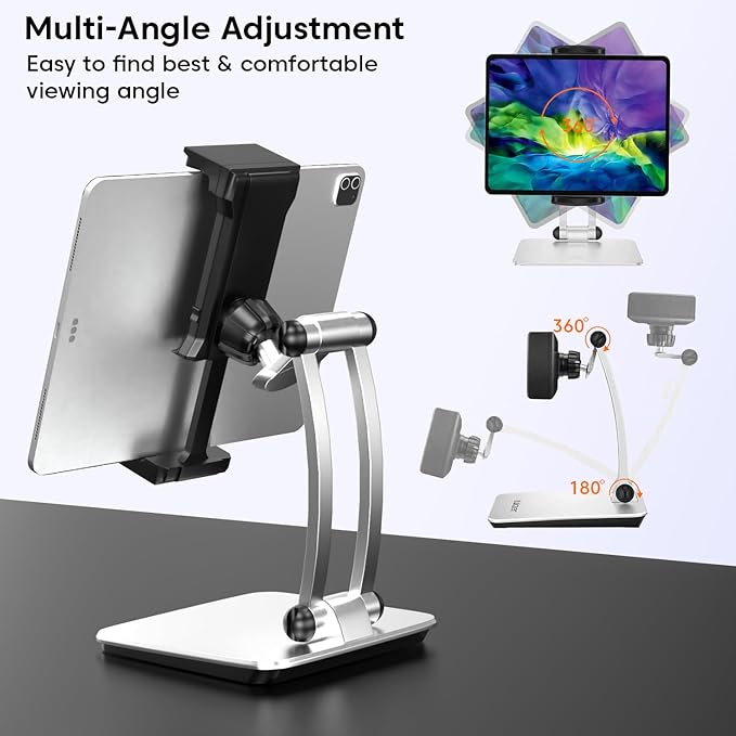 Sounce Foldable Professional Tablet & Mobile Stand Holder with 360° Swivel & Height/Angle Adjustment| Sturdy & Heavy Metal Base, Solid Structure Cable Clips| for Up to 12 Inch Screen Devices (Grey)