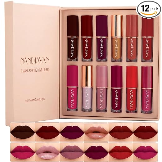 Mini matte liquid lipstick combo pack of 12 with bold dark shades like burgundy, wine, deep plum, maroon, coffee brown, and classic red, perfect for dusky skin tone and everyday glam look Smudge-proof and transfer-proof formula with rich color payoff in just one stroke; this long lasting lipstick set offers non-sticky wear and keeps lips comfortable all day without drying Waterproof matte finish lipsticks ideal for 9 to 5 wear, date nights, parties, or office makeup; compact 1.5ml size makes it travel-friendly and perfect for gifting or on-the-go touchups Good quality mini lipsticks with lightweight formula that glides smoothly; suitable for Indian skin tones and includes a mix of nude, brown, and bold lip colors for every makeup style Ideal lipstick gift combo for women and girls; adds elegance to festive looks, wedding makeup or college essentials; perfect alternative to bulky lip palettes or traditional stick lipstick