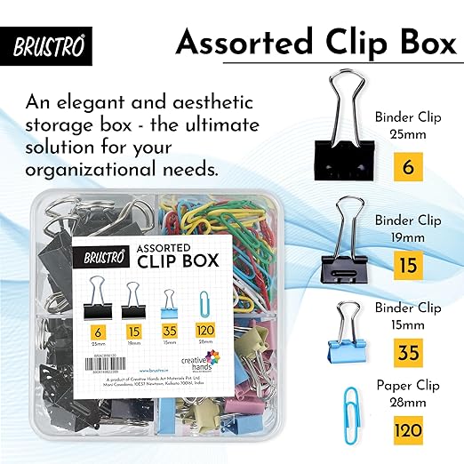 BRUSTRO Assorted Clip Box | Includes 120 Paper Clips-28mm & 56 Binder Clips (25mm- 6 pcs| 19mm- 15 pcs| 15mm- 35pcs) | Home, Office, Stationery use, Ideal for Kids and Adults, Reusable, Flexible